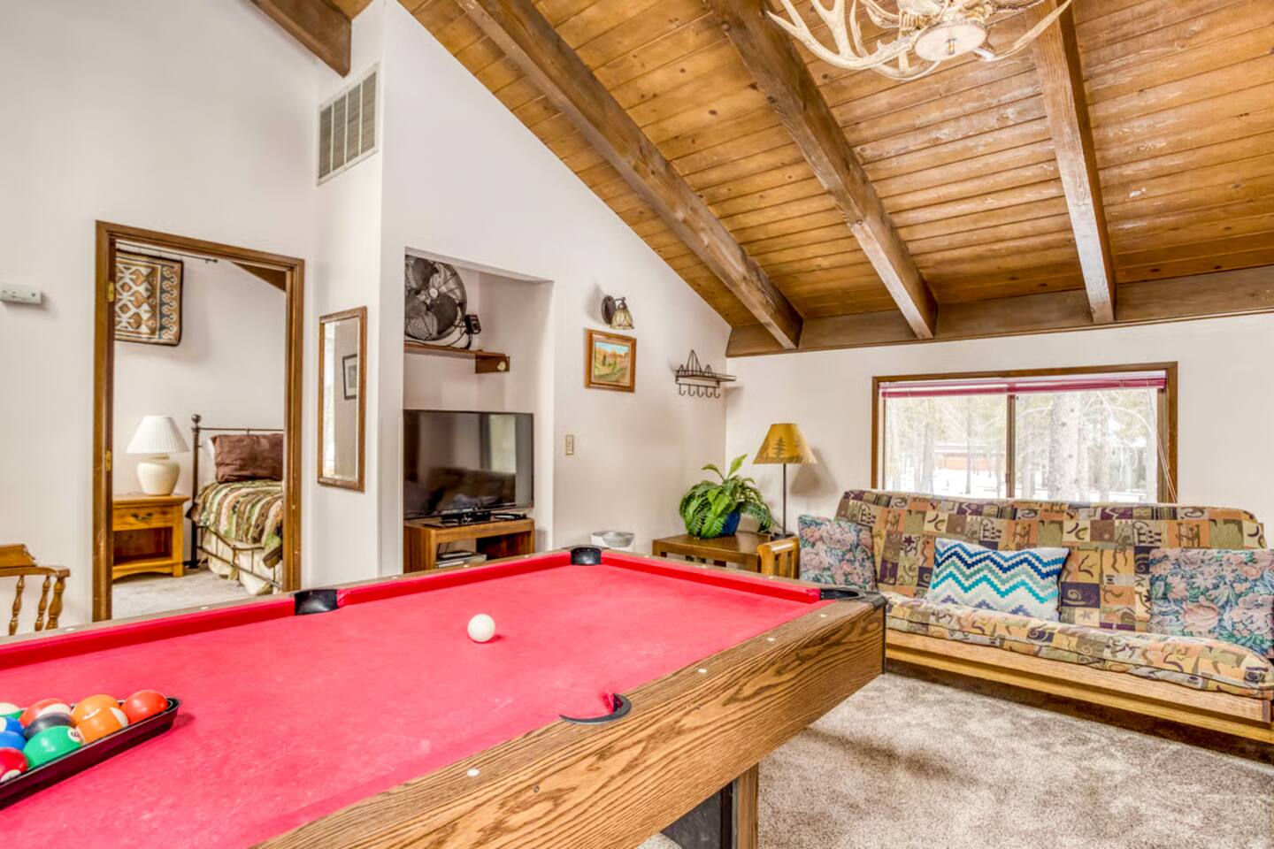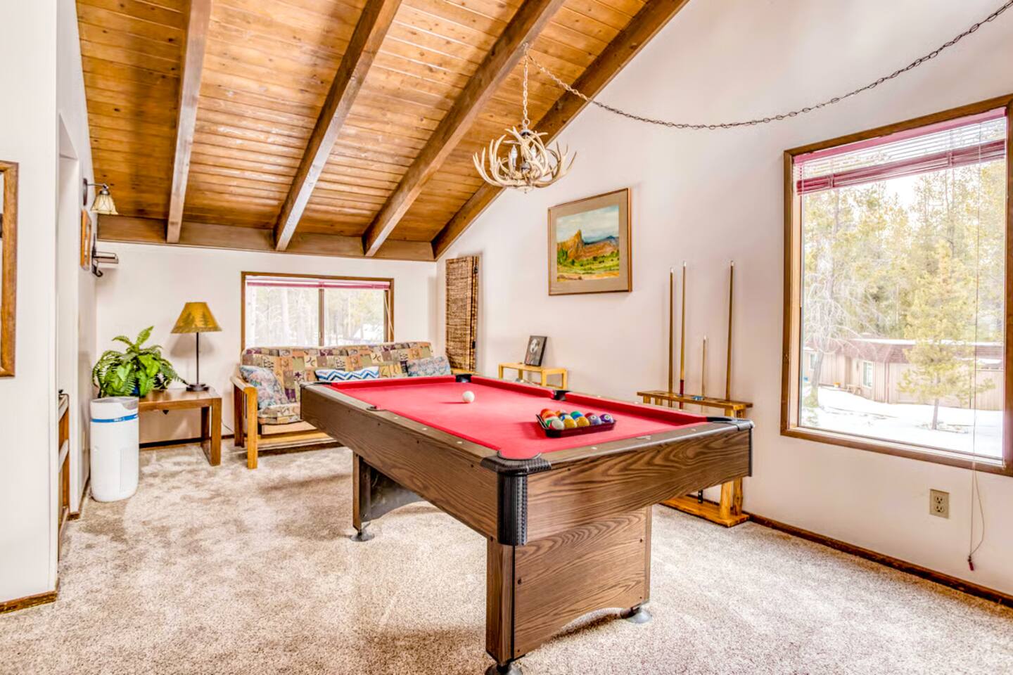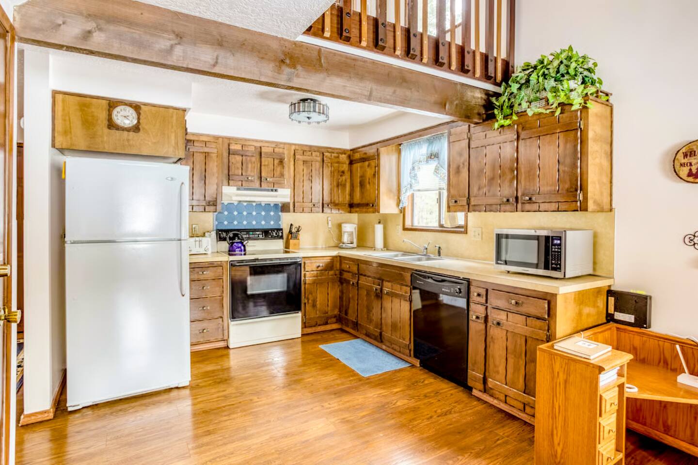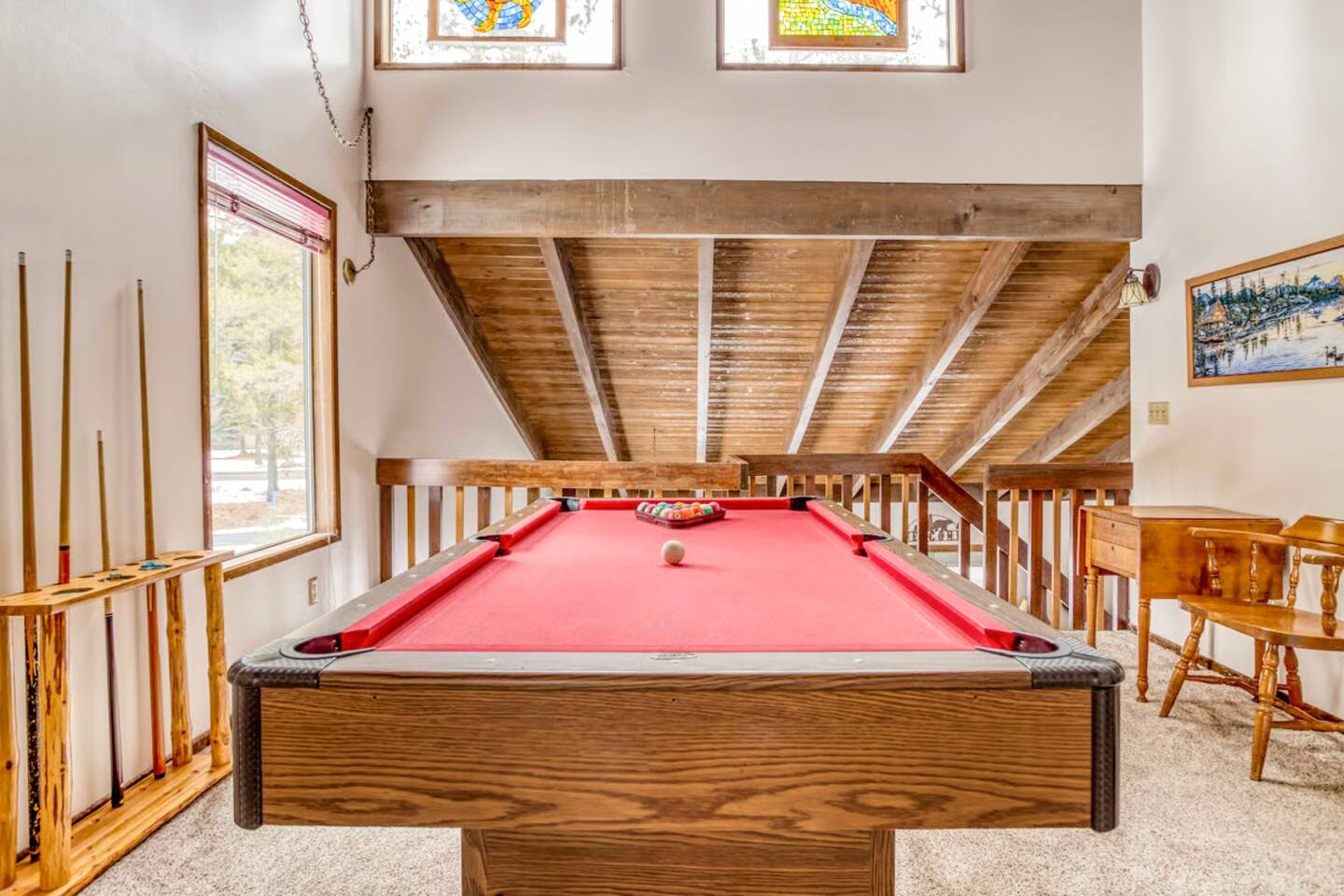 This spacious, classic cabin offers a warm, inviting atmosphere with plenty of room for your family and friends. Bring along up to two furry friends or take advantage of a Pack n' Play travel crib for your little ones. Main floor: *Living room: Settle into the large living room, featuring ample seating, a flat-screen Smart TV for your personal streaming apps, and a cozy electric fireplace. *Kitchen and dining: Prepare meals in the full kitchen, equipped with a dishwasher, oven, stove, full-sized fridge, coffee maker, kettle, toaster, and blender, plus cookware, dishware, wine glasses, and cooking essentials. Enjoy meals in the large dining room. *Bedrooms: This floor includes a cozy bedroom with a queen bed and a second bedroom with a bunk bed (double on the bottom, single on the top). Both have room-darkening shades. *Bathroom and laundry: A full bathroom with a standing shower and a washer and dryer are available for your convenience. Upstairs loft: *Game room and workspace: The large upstairs family room features a pool table, a comfortable double futon with a privacy screen, and a dedicated workspace with a large widescreen monitor. *Primary suite: The primary bedroom includes a queen bed and a full en suite bathroom with a combination bath and shower. Outdoor area: *Step outside to find direct trail access, a large private hot tub, a gas grill, and an outdoor dining and seating area. *A full garage has plenty of bikes, cornhole boards, and other amenities that are available to guests. Amenities for your stay: *Keep comfortable with conditioning, central air, portable fans and extra blankets *Entertainment: Fast WiFi, board games, and books (take it with you if you aren't done!) *Family-friendly: Pack n' Play travel crib, children's books, and a children's bike trailer included. *Pet-friendly: Waste bags provided!
