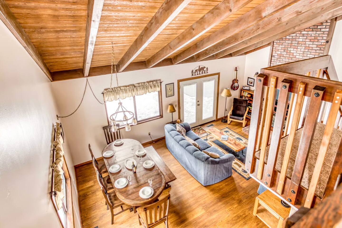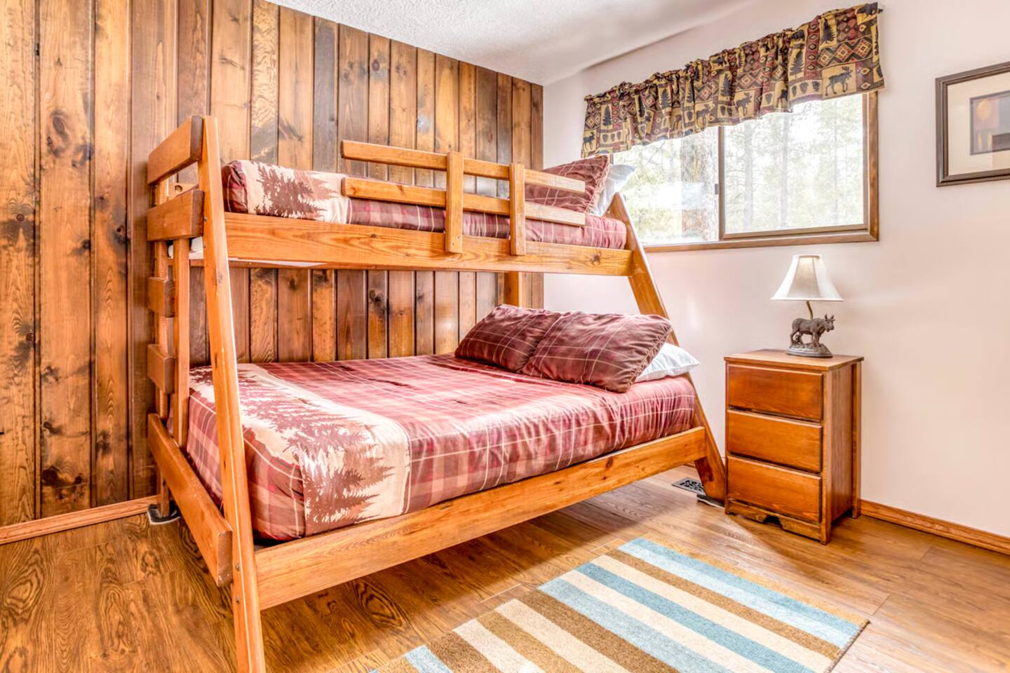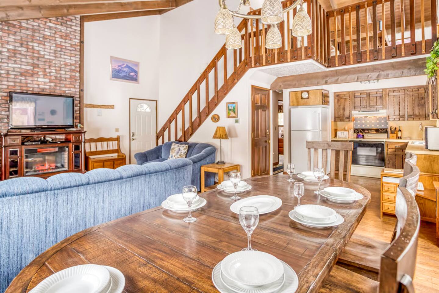 This spacious, classic cabin offers a warm, inviting atmosphere with plenty of room for your family and friends. Bring along up to two furry friends or take advantage of a Pack n' Play travel crib for your little ones. Main floor: *Living room: Settle into the large living room, featuring ample seating, a flat-screen Smart TV for your personal streaming apps, and a cozy electric fireplace. *Kitchen and dining: Prepare meals in the full kitchen, equipped with a dishwasher, oven, stove, full-sized fridge, coffee maker, kettle, toaster, and blender, plus cookware, dishware, wine glasses, and cooking essentials. Enjoy meals in the large dining room. *Bedrooms: This floor includes a cozy bedroom with a queen bed and a second bedroom with a bunk bed (double on the bottom, single on the top). Both have room-darkening shades. *Bathroom and laundry: A full bathroom with a standing shower and a washer and dryer are available for your convenience. Upstairs loft: *Game room and workspace: The large upstairs family room features a pool table, a comfortable double futon with a privacy screen, and a dedicated workspace with a large widescreen monitor. *Primary suite: The primary bedroom includes a queen bed and a full en suite bathroom with a combination bath and shower. Outdoor area: *Step outside to find direct trail access, a large private hot tub, a gas grill, and an outdoor dining and seating area. *A full garage has plenty of bikes, cornhole boards, and other amenities that are available to guests. Amenities for your stay: *Keep comfortable with conditioning, central air, portable fans and extra blankets *Entertainment: Fast WiFi, board games, and books (take it with you if you aren't done!) *Family-friendly: Pack n' Play travel crib, children's books, and a children's bike trailer included. *Pet-friendly: Waste bags provided!